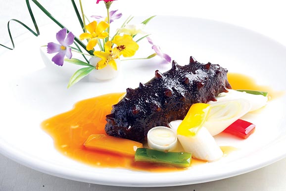 4、凈鍋上火,注入150 g清湯,加入料湯、精鹽、味精、胡椒粉、白糖,開后用濕淀粉勾成米湯芡汁,淋入蔥油,澆在如意海參上,加以點綴即成。