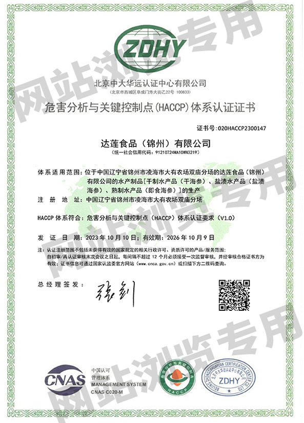 達(dá)蓮公司的遼參產(chǎn)品通過養(yǎng)殖、加工雙有機(jī)產(chǎn)品認(rèn)證、遼參認(rèn)證、ISO9001質(zhì)量管理體系要求認(rèn)證ISO22000食品安全管理體系、食品鏈中各類組織的要求認(rèn)證、HACCP危險分析與關(guān)鍵控制點(diǎn)認(rèn)證等。